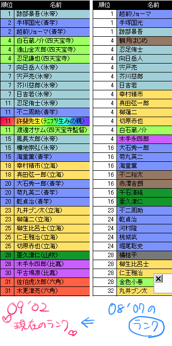 テニプリキャラ、100人以上に順位をつけるというやつなんですが、半年前の7月と、現在(2009年02月)のランクを比べてみたんですが…。